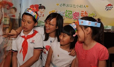 京城首家“必勝客綠色小超人主題餐廳”近日正式揭幕。大學(xué)生志愿者們帶領(lǐng)來自呼家樓小學(xué)的首批“必勝客綠色小超人”在這里開始了一場(chǎng)“畫手絹游戲”。