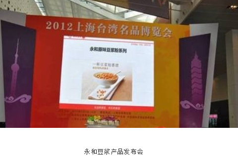 2012年4月5日,知名品牌永和豆漿赴上海世博展覽館參加2012臺灣名品博覽會。本次博覽會是由上海市人民政府、臺北世界貿易中心共同舉辦,博覽會為期4天。在上海展出前,2009年至今,臺灣名品博覽會3年來已陸續在大陸舉辦13場次,參觀的企業與民眾逾400萬人次。作為2012年臺灣名品展的重要一站,2012上海臺灣名品展倍受關注與期待。