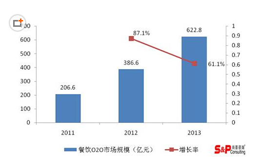 中國餐飲行業的線下市場規模非常龐大,這為餐飲O2O行業發展提供了廣闊的空間。有關數據顯示,2011年中國餐飲O2O市場規模為206.6億元;2012年中國餐飲O2O市場規模為386.6億元,同比增長87.1%;2013年市場規模達到622.8億元,同比增長61.1%。