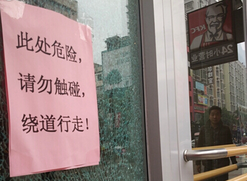 1月7日,記者在肯德基一樓門口看到,一塊鋼化玻璃被擊穿一個窟窿,整塊玻璃全部碎了,卻沒有掉下來。玻璃上貼了一張警示語:“此處危險,請勿觸碰,繞道行走”。據一名肯德基員工稱,這塊玻璃可能是由于顧客在玩耍時,不小心碰爛的,事情發生有一個多星期了。已經訂了新的玻璃,但是還未到貨。
