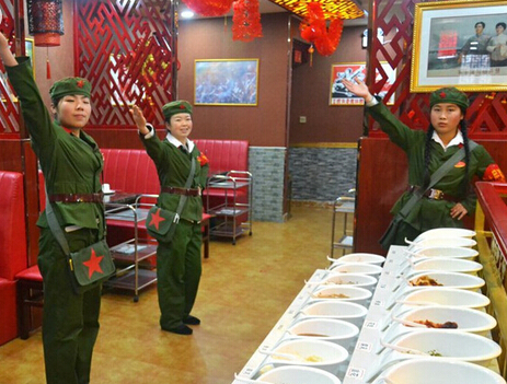 2015年1月10日,在甘肅省平?jīng)鍪幸患倚麻_張的火鍋店,服務(wù)員們?nèi)堪绯伞凹t衛(wèi)兵”的樣子,每當(dāng)有客人走進大廳,店門口的迎賓就喊:“老鄉(xiāng)您好!歡迎下鄉(xiāng)改善伙食!痹谶@家以“紅色餐飲”為主題文化的火鍋店,記者還發(fā)現(xiàn),這家火鍋店吸人眼球的不僅僅是服務(wù)員“紅衛(wèi)兵”的打扮,還有許多新鮮的叫法更是讓人好奇,甚至有時候讓前來消費的顧客忍俊不禁。店內(nèi)服務(wù)員管同事叫“社員”,稱包廂為“公社”,稱主管為“隊長”,他們還把菜譜叫“革命語錄”,把啤酒叫做“地雷”,白酒稱作“炸彈”,餐廳紙是“雞毛信”,代金券是“糧票”。