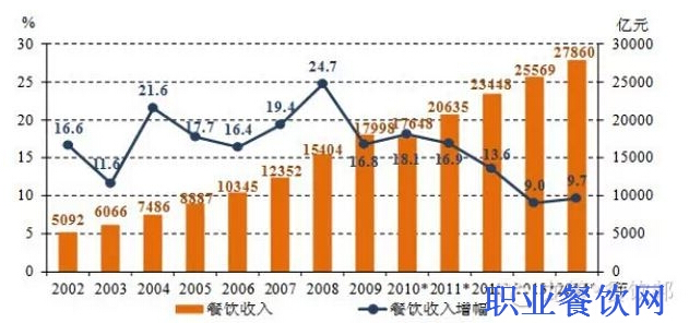 據國家統計局最新發布的數據顯示,2014年全國餐飲收入27860億元,同比增長9.7%,比上年加快0.7個百分點,終止了連續三年增速下滑的頹勢。中國烹飪協會會長姜俊賢表示,按照這一增速,2015年中國餐飲業將邁入3萬億元新時代。