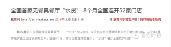 2013年9月開張至今的水貨,成為了中國餐飲轉型的催化劑:超炫的海底世界,無餐具徒手體驗、時尚潮流的視覺沖擊再加上一系列創新的產品和口味,使其在一年多的時間完成加盟近100家,11月全國落地開張52家,單店投資均不低于180萬,加盟費50-120萬不等,一年時間實現品牌盈利約近億元,創造餐飲品牌連鎖的奇速。
