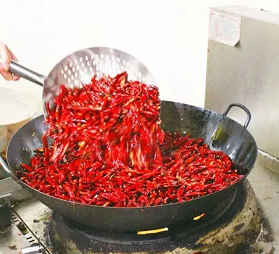 大鐵鍋上火,下大豆油50斤燒至三成熱,調成中火,陸續下入泡椒50斤,不停翻炒約半小時,與此同時將整塊的永川豆豉3斤剁成細粒(不要剁碎),至泡椒炒出香后下入剁好的豆豉再炒約15分鐘,下入泡菜丁25斤,繼續翻炒半小時,一起炒香后停火。