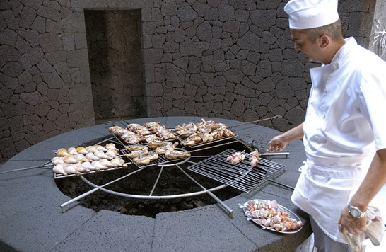 隨著夏日的臨近,燒烤季已經(jīng)來臨,但相信西班牙加那利群島(Canary Islands)的“魔鬼”餐廳(El Diablo)會(huì)帶給你不一樣的體驗(yàn)。這家餐廳將烤肉架放在火山地?zé)峥谔帲柚?50到500攝氏度的高溫地?zé)峥救夂涂爵~。