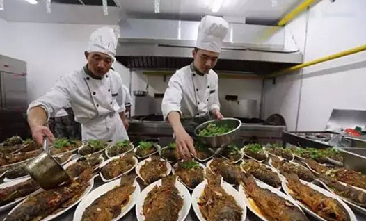 餐廳中,丁司務(wù)長正抱著一桶水往餐臺里倒,記者急忙走上去幫忙,原來他是在準(zhǔn)備飯菜的保溫工作。5時40分,4道菜已經(jīng)擺放到加熱好的餐臺上。