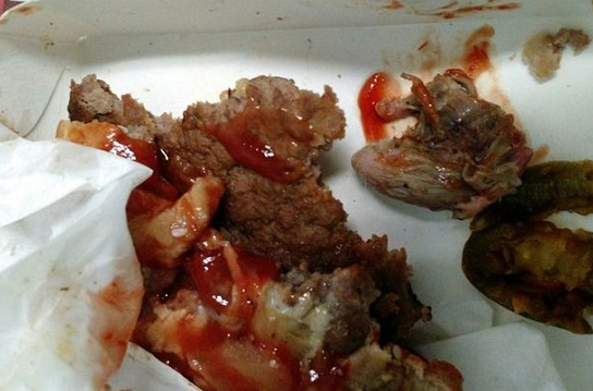 這名男子在墨西哥特萊內潘特拉市的一家麥當勞吃多汁漢堡,卻發現了讓人作嘔的東西。他拍照上傳到了網上,照片中能看到嚼碎的漢堡和一只支離破碎的頭。