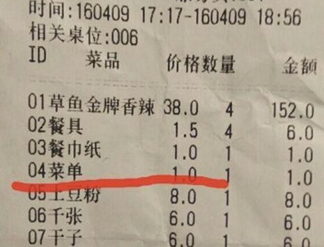 4月10日,江蘇省鎮江市市民馬先生到新開張的諸葛烤魚店吃飯,最后結賬的時候,收費清單上的“點菜單”費用,讓馬先生一家有些不高興。