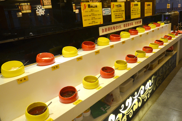 調料是自助的,品種很多,可以按自己的口味自行調配,每人5元。