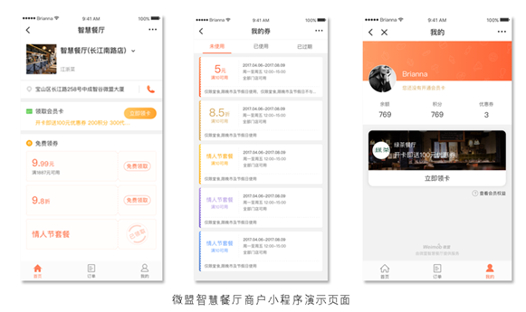 據了解,餐飲商戶通過微盟智慧餐廳后臺發布餐廳的智店小程序,智店小程序不僅能與商家的公眾號相互跳轉,而且與智慧餐廳系統互通。目前小程序與公眾號已實現會員、訂單、權益等的數據互通。當用戶進入商家的小程序時,系統自動識別用戶的會員身份,并且自動同步該用戶的訂單權益數據。用戶在小程序領取的優惠券和會員卡與公眾號同步;同樣,用戶在公眾號里領的券和卡,在小程序里也能查看和使用。值得一提的是,由于微盟智慧餐廳的卡券能力與微信原生卡券體系打通,因此通過小程序領取的卡券可以直接添加到微信卡包。據介紹,后續微盟智慧餐廳的點餐、外賣等功能也將與小程序打通,屆時小程序的連接能力將幫助餐飲商戶連接更多的餐飲消費場景。