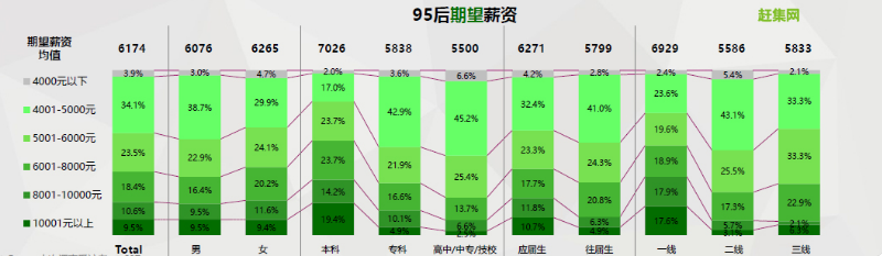趕集網(wǎng)調(diào)研數(shù)據(jù)顯示,2018年95后應(yīng)屆畢業(yè)生期望薪資的均值為6174元,其中9.5%的畢業(yè)生希望月薪超過10000元,而40%的畢業(yè)生對(duì)月薪的期望都超過8000元。與往屆生相比,應(yīng)屆生對(duì)薪資的期望更高。然而,95后應(yīng)屆畢業(yè)生的實(shí)際薪資平均值為5429元,80%的畢業(yè)生實(shí)際薪資在8000元以下,這說明理想與現(xiàn)實(shí)仍然存在一定差距。